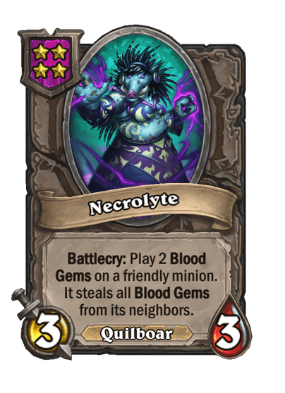 Battlecry: Play 2 Blood Gems on a friendly minion. It steals all Blood Gems from its neighbors.