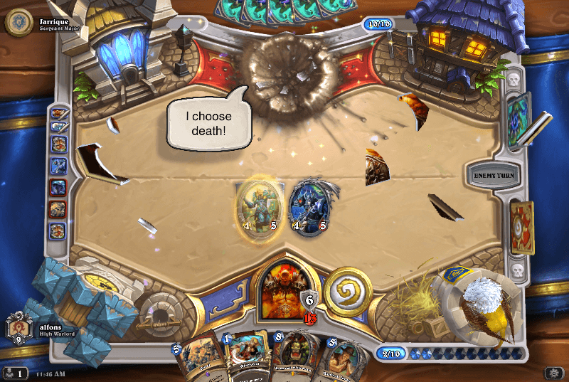Nem mellesleg, Grommash Hellscream és Execute aktiválásához is kiváló. Mivel csak egy darab van belőle a pakliban, érdemes bölcsen felhasználni. Lényegében lassabb meccsek ellen is hasznos tud lenni ha felhúzzuk, pont az előbb említett két lap miatt!