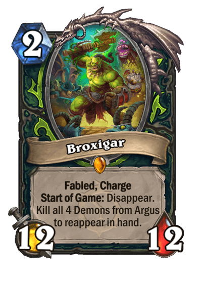Broxigar: 2 Mana, 12/12, Legendary. Fabled. Charge. Meccs kezdetén: Eltűnik. Öld meg mind a 4 Demont Argus-tól, hogy újra megjelenjen a kezedben.