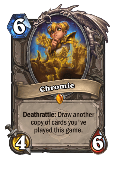 Chromie: 6 Mana, 4/6, Legendary. Deathrattle: Húzol egy másik másolatot azokból a kártyákból, amelyeket kijátszottál ezen a meccsen.