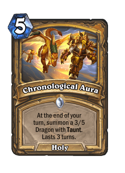 Chronicle Keeper: 4 Mana, 3/6, Common. Battlecry: Ha van a kezedben egy Dragon, akkor ez Taunt-ot és Divine Shield-et kap.