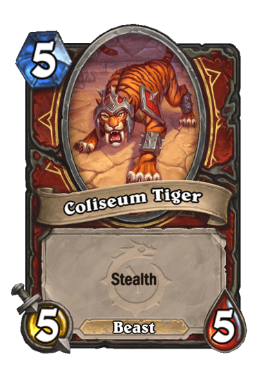 Gladiatorial Combat: 5 Mana, Epic, Spell. Megidéz egy véletlenszerűen kiválasztott lényt a paklidból. Megidéz egy 5/5-ös Tigert Stealth-el az ellenfelednek.