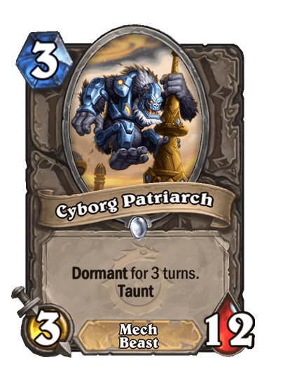Cyborg Patriarch: 3 Mana, 3/12, Common, Mech, Beast. Alszik 3 körön át. Taunt.