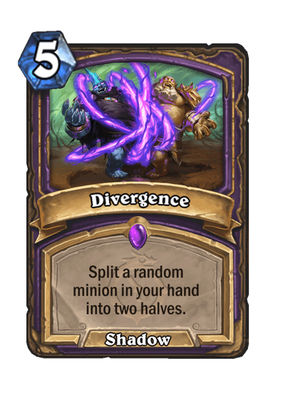 Divergence: 5 Mana, Epic, Shadow, Spell. Egy véletlenszerűen kiválasztott lényt a kezedben két részre vág.