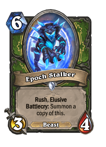 Chrono-Lord Epoch: 6 Mana, 7/5, Legendary, Dragon. Battlecry: Elpusztítja az összes lényt, amit az ellenfeled kijatszott az előző körben.