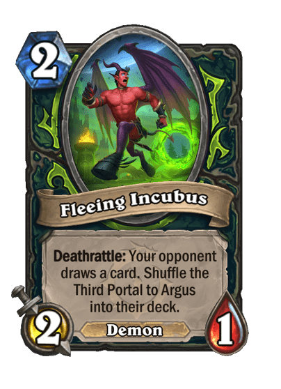 - Fleeing Incubus: 1 Mana, 2/1, Demon. Deathrattle: Az ellenfeled* húz egy lapot. Belekeveri a Second Portal to Argus-t a paklidba.