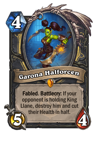 Garona Halforcen: 4 Mana, 5/4, Legendary. Fabled. Battlecry: Ha az ellenfeled kezében van King Llane, akkor elpusztítod őt és lefelezed az Életét.