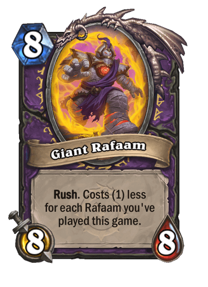- Giant Rafaam: 8 Mana, 8/8. Rush. 1-gyel kevesebbe kerül annyiszor, ahány Rafaamot játszottál ki ezen a meccsen.