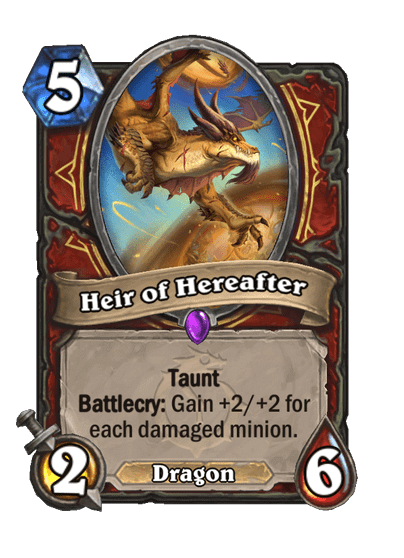 Heir of Hereafter: 5 Mana, 2/6, Epic, Dragon. Taunt. Battlecry: +2/+2-t kap minden egyes sérült lény után.