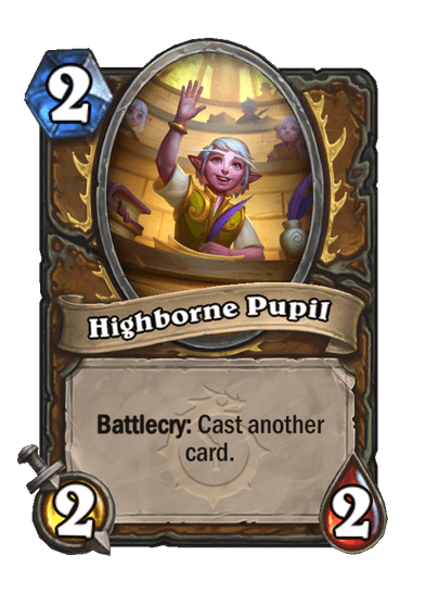 - Highborne Pupil: 2 Mana, 2/2. Battlecry: Elhasznál egy másik kártyát.