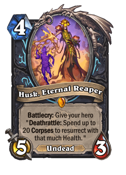 Husk, Eternal Reaper: 4 Mana, 5/3, Legendary, Undead. Battlecry: A hősödnek a következőt adja: "Deathrattle: Elköltesz legfeljebb 20 hullát, hogy feltámadjon annyi Élettel, amennyi hullát elköltöttél."