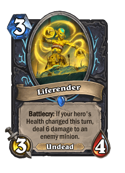 Liferender: 3 Mana, 3/4, Rare, Undead. Battlecry: Ha a hősöd Élete változott ebben a körben, akkor 6-ot sebez egy ellenséges lénynek.