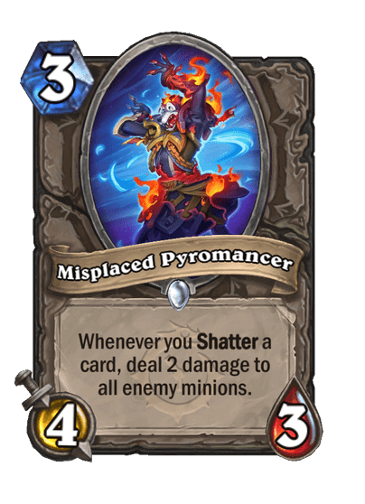 Misplaced Pyromancer: 3 Mana, 4/3, Common. Amikor összetörsz (Shatter mechanizmus) egy kártyát, 2-t sebez az összes ellenséges lénynek.
