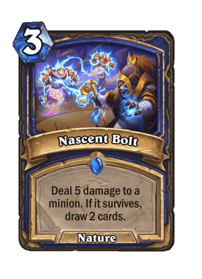 Nascent Bolt: 3 Mana, Rare, Nature, Spell. 5-öt sebez egy lénynek. Ha az túléli, akkor húzol 2 lapot.