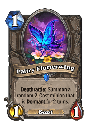 Paltry Flutterwing: 1 Mana, 1/1, Rare, Beast. Deathrattle: Megidéz egy véletlenszerűen kiválasztott 2 Manás lényt, ami alszik 2 körön át.