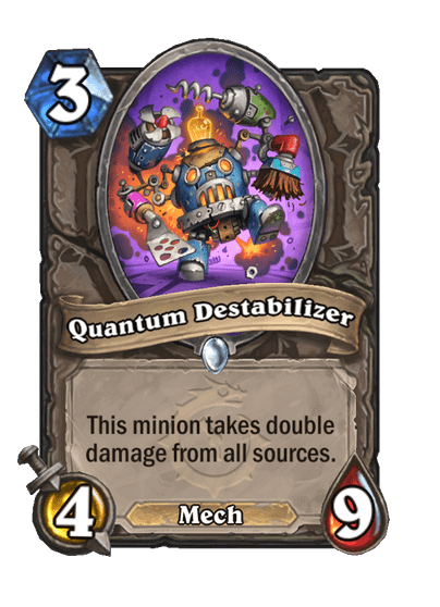 Quantum Destabilizer: 3 Mana, 4/9, Common, Mech. Ez a lény dupla sebzést kap mindentől.