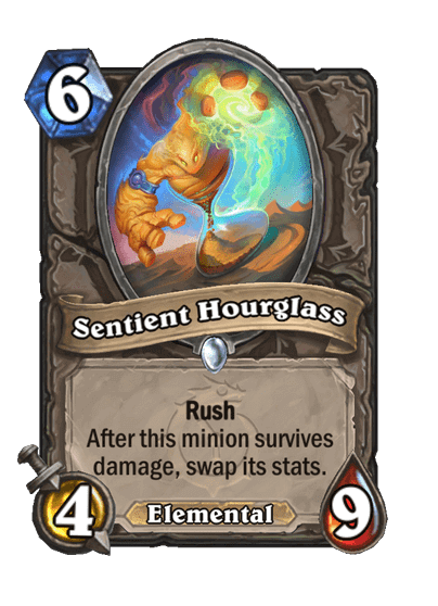Sentient Hourglass: 6 Mana, 4/9, Common, Elemental. Rush. Miután ez a lény túlél egy sebzést, megcseréli az értékeit.