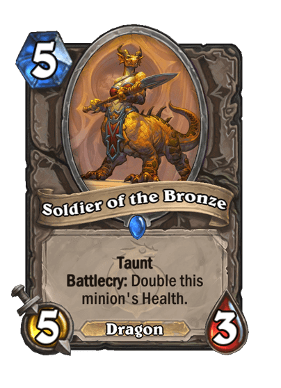 Soldier of the Bronze: 5 Mana, 5/3, Rare, Dragon. Taunt. Battlecry: Megduplázza ennek a lénynek az Életét.