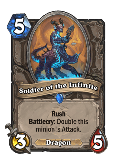 Soldier of the Infinite: 5 Mana, 3/5, Rare Dragon. Rush. Battlecry: Megduplázza ennek a lénynek a Támadását.