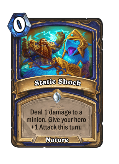Static Shock: 0 Mana, Common, Nature, Spell. 1-et sebez egy lénynek. A hősödnek +1 Támadást ad ebben a körben.