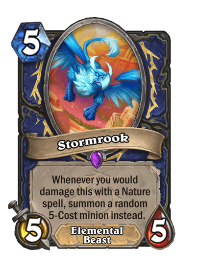 Stormrook: 5 Mana, 5/5, Epic, Elemental, Beast. Amikor megsebeznéd ezt egy Nature spellel, megidéz egy véletlenszerűen kiválasztott 5 Manás lényt helyette.