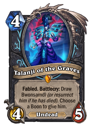 Talanji of the Graves: 4 Mana, 4/5, Legendary, Undead. Fabled. Battlecry: Felhúzod Bwonsamdi-t (vagy feltámasztja őt, ha már meghalt). Válassz egy Boon-t, amit neki adsz.