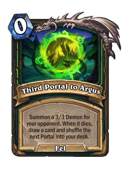- Third Portal to Argus: 0 Mana, Fel. Megidéz egy 3/1-es Demont az ellenfelednek. Amikor az meghal, húzol egy lapot és belekeveri a következő portált a paklidba.