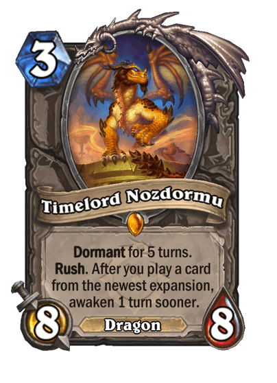Timelord Nozdormu: 3 Mana, 8/8, Legendary, Dragon. Alszik 5 körön át. Rush. Miután kijátszol egy kártyát a legújabb kiegészítőből, 1 körrel hamarabb ébred föl.