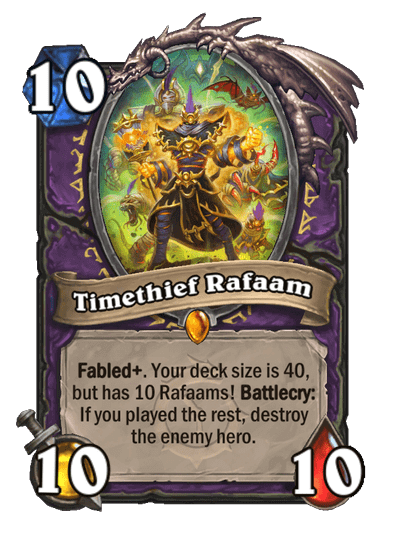 Timethief Rafaam: 10 Mana, 10/10, Legendary. Fabled+. A paklid mérete 40, de 10 Rafaammal rendelkezik. Battlecry: Ha kijátszottad a többit, elpusztítja az ellenséges hőst.