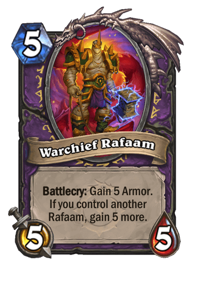 - Warchief Rafaam: 5 Mana, 5/5. Battlecry: Kapsz 5 Armort. Ha van még egy Rafaamod, akkor kapsz még 5 Armort.