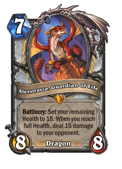 Alexstrasza, Guardian of Life: 7 Mana, 8/8, Legendary, Dragon. Battlecry: A fennmaradó Életedet 15-re állítja. Amikor eléred a maximum Életet, akkor 15-öt sebez az ellenfelednek.