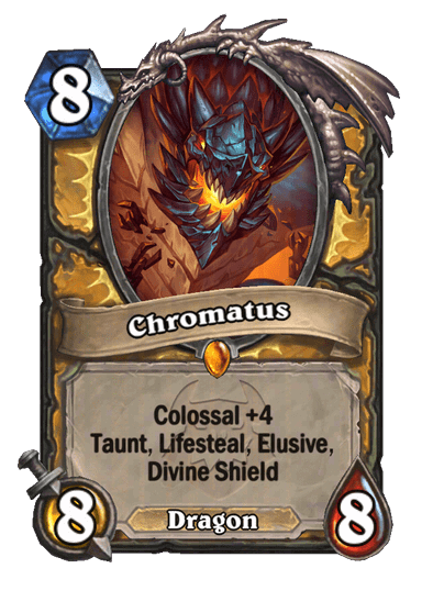Chromatus: 8 Mana, 8/8, Legendary, Dragon. Colossal +4. Taunt. Lifesteal. Elusive. Divine Shield.