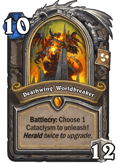 Deathwing, Worldbreaker: 10 Mana, 12 Armor, Legendary, Hős kártya. Battlecry: Válassz 1 Cataclysm-et, amit elszabadít! Herald-olj kétszer, hogy fejlődjön.