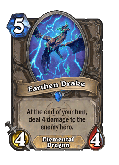 Earthen Drake: 5 Mana, 4/4, Rare, Elemental, Dragon. A köröd végén 4-et sebez az ellenséges hősnek.
