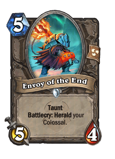 Envoy of the End: 5 Mana, 5/4, Common. Taunt. Battlecry: Herald-olja a Colossalodat.