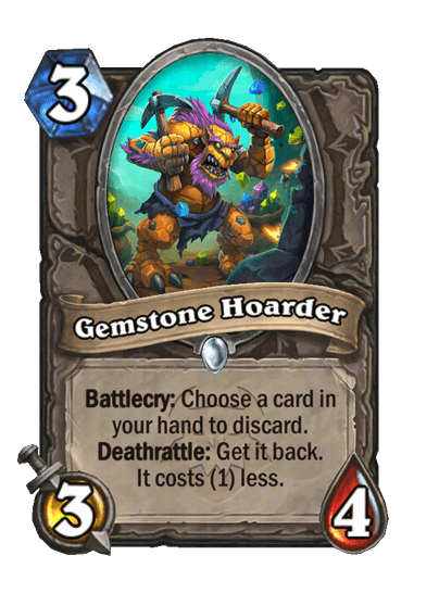 Gemstone Hoarder: 3 Mana, 3/4, Common. Battlecry: Válassz ki egy kártyát a kezedben, amit eldobsz. Deathrattle: Visszakapod azt. Az 1-gyel kevesebbe kerül.