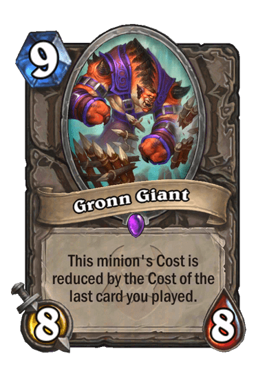 Gronn Giant: 9 Mana, 8/8, Epic. Ennek a lénynek a Manaköltsége annyival lesz kevesebb, mint amennyibe a legutóbb kijátszott lényed került.