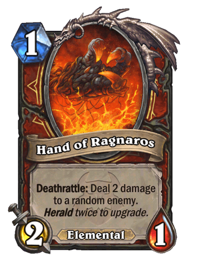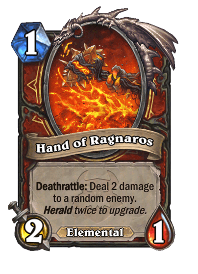 - Hand of Ragnaros: 1 Mana, 2/1, Elemental. Deathrattle: 2-t sebez egy véletlenszerűen kiválasztott ellenségnek. Herald-olj kétszer, hogy fejlődjön.