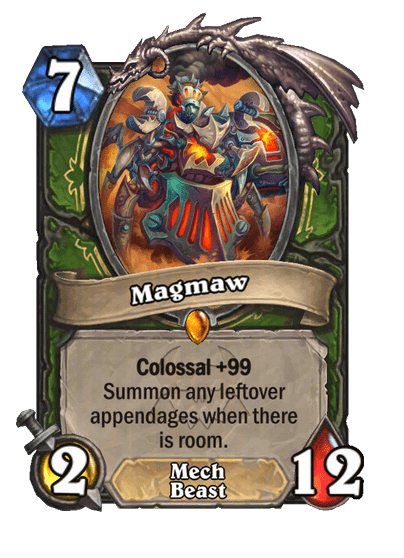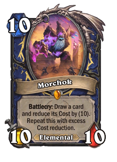 Morchok: 10 Mana, 10/10, Legendary, Elemental. Battlecry: Húzol egy lapot, és lecsökkenti a Manaköltségét 10-zel. Megismétli ezt a fennmaradó Manaköltség csökkentéssel.