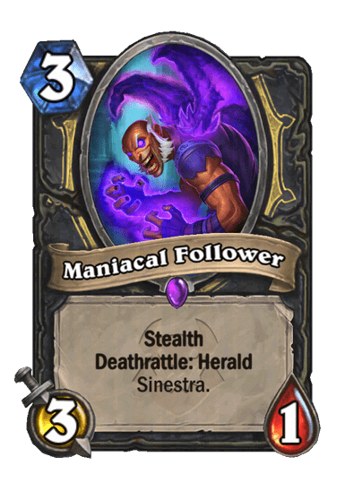 Maniacal Follower: 3 Mana, 3/1, Epic,. Stealth. Deathrattle: Herald-olja Sinestrat.