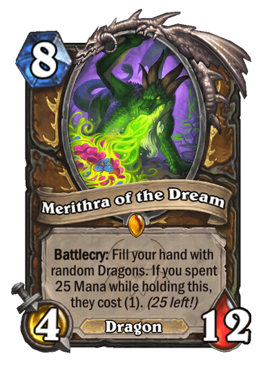 Merithra of the Dream: 8 Mana, 4/12, Legendary, Dragon. Battlecry: Telerakja a kezedet véletlenszerűen kiválasztott Dragonokkal. Ha elköltöttél 25 Manát, amíg ez a kezedben volt, akkor azok 1-be kerülnek. (25 maradt!)