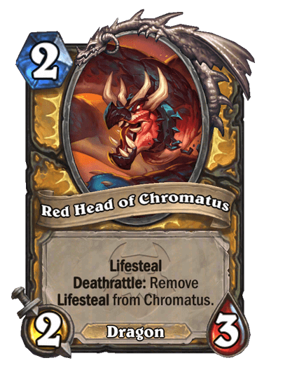 - Red Head of Chromatus: 2 Mana, 2/3, Dragon. Lifesteal. Deathrattle: Eltávolítja az Lifesteal-t Chromatus-tól.