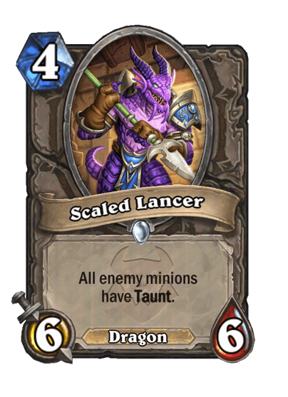 Scaled Lancer: 4 Mana, 6/6, Common, Dragon. Az összes ellenséges lény Taunt-ot kap.