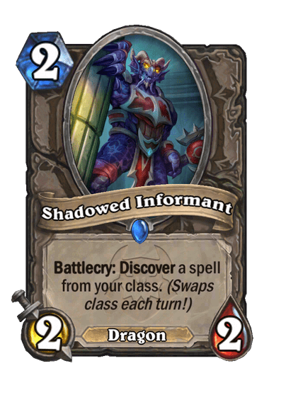 Shadowed Informant: 2 Mana, 2/2, Rare, Dragon. Battlecry: Felfedezel (Discover mechanizmus) egy spellt a kasztodtól. (Kasztot cserél minden egyes körben!)