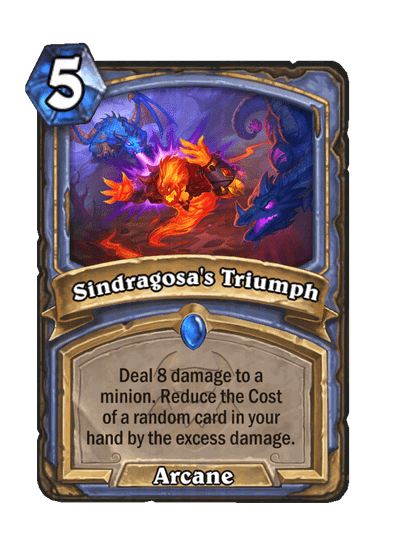 Azshara's Triumph: 1 Mana, Epic, Arcane, Spell. Belekever 5 véletlenszerűen kiválasztott lényt a paklidba, melyek 8-ba, vagy annál többe kerülnek. Megduplázza az értékeiket.