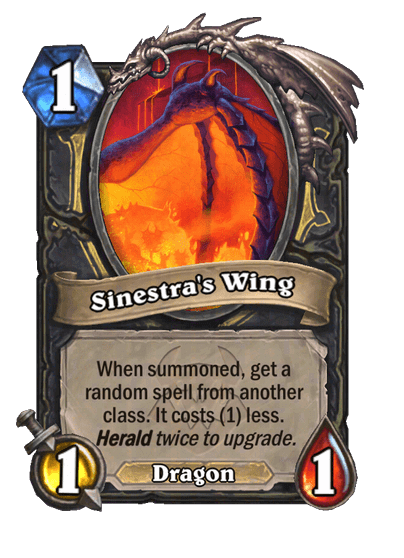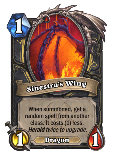 - Sinestra's Wing: 1 Mana, 1/1, Dragon. Amikor megidéződik, kapsz egy véletlenszerűen kiválasztott spellt egy másik kaszttól. Az 1-gyel kevesebbe kerül. Herald-olj kétszer, hogy fejlődjön.
