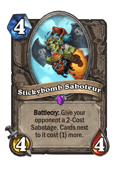 Stickybomb Saboteur: 4 Mana, 4/4, Epic. Battlecry: Az ellenfelednek egy 2 Manás Sabotage-t ad. A mellette lévő lapok 1-gyel többe kerülnek.