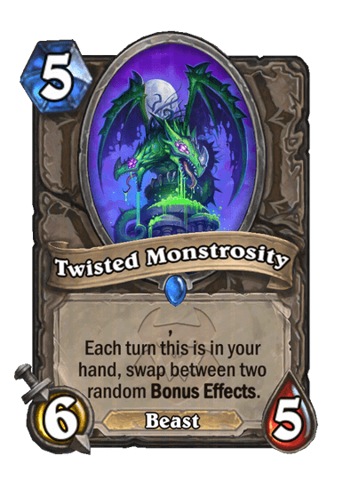 Twisted Monstrosity: 5 Mana, 6/5, Rare, Beast. Elusive. Taunt. Minden egyes körben, amíg ez a kezedben van, két véletlenszerűen kiválasztott bónusz képesség közt vált.