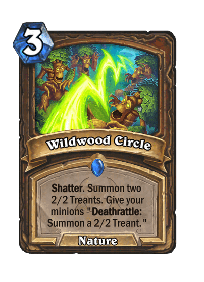 Wildwood Circle: 3 Mana, Rare, Nature, Spell. Shatter. Megidéz két 2/2-es Treantot. A lényeidnek a következőt adja: "Deathrattle: Megidéz egy 2/2-es Treantot."