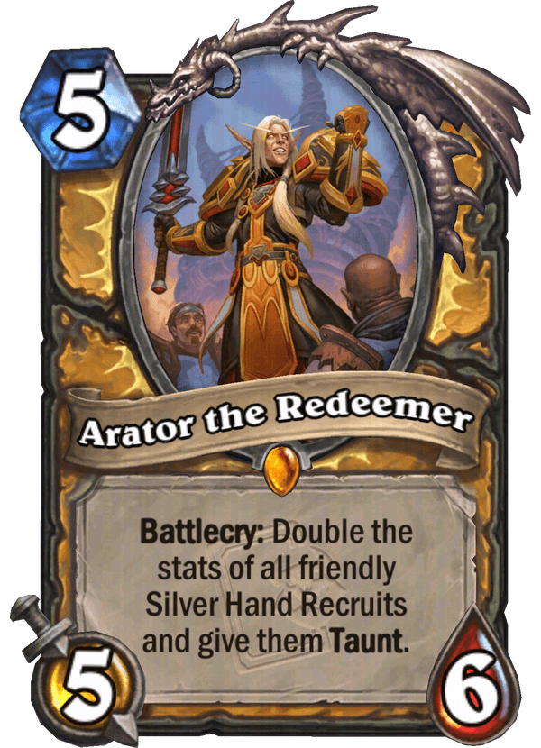 Arator the Redeemer: 5 Mana, 5/6, Legendary. Battlecry: Megduplázza az értékeit az összes Silver Hand Recruitodnak és Taunt-ot ad nekik.
